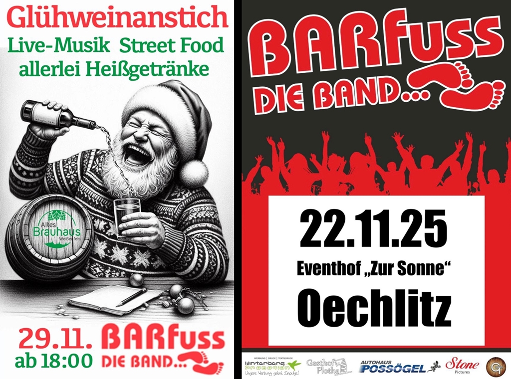 die letzten beiden öffentlichen Veranstaltungen stehen vor der Tür, draußen wird es langsam kalt, das Weihnachtsfest naht. Lasst uns gemeinsam noch mal feiern. Am 22.11. im Eventhof “Zur Sonne“ in Oechlitz, sowie - bei hoffentlich kühlen Temperaturen aber schönem Wetter – am 29.11. im Alten Brauhaus in Weißenfels, zum Glühweinanstich.